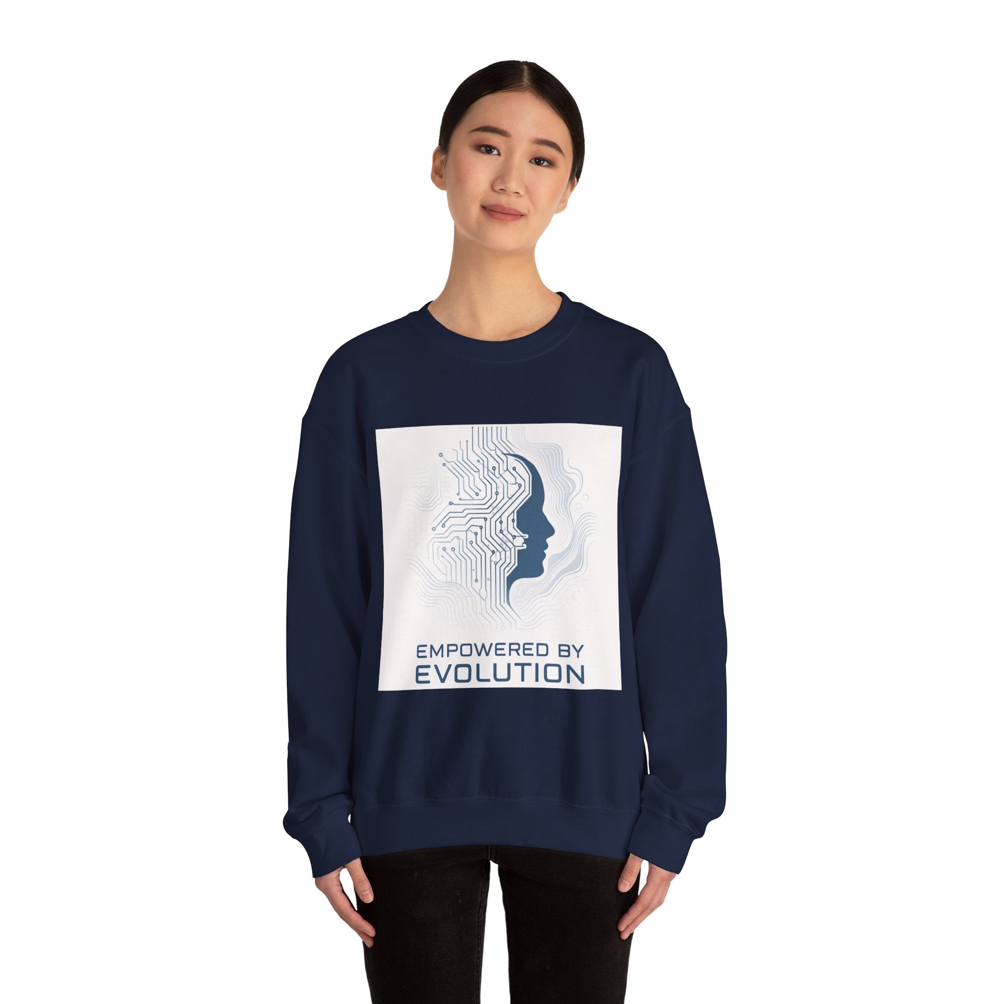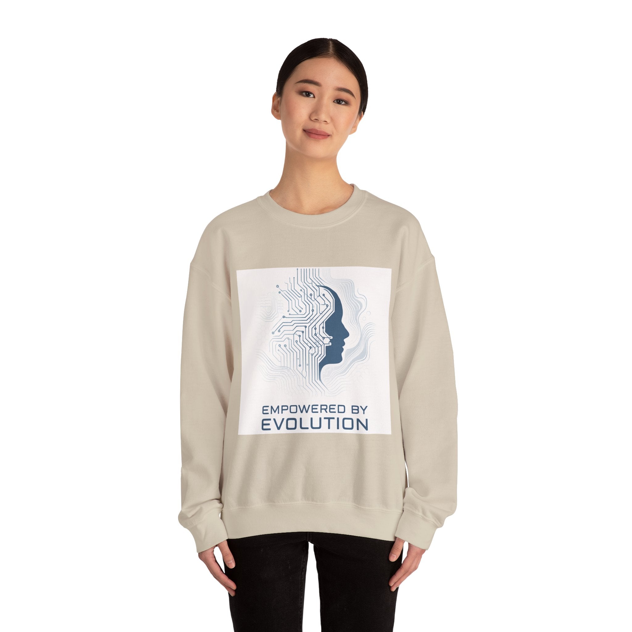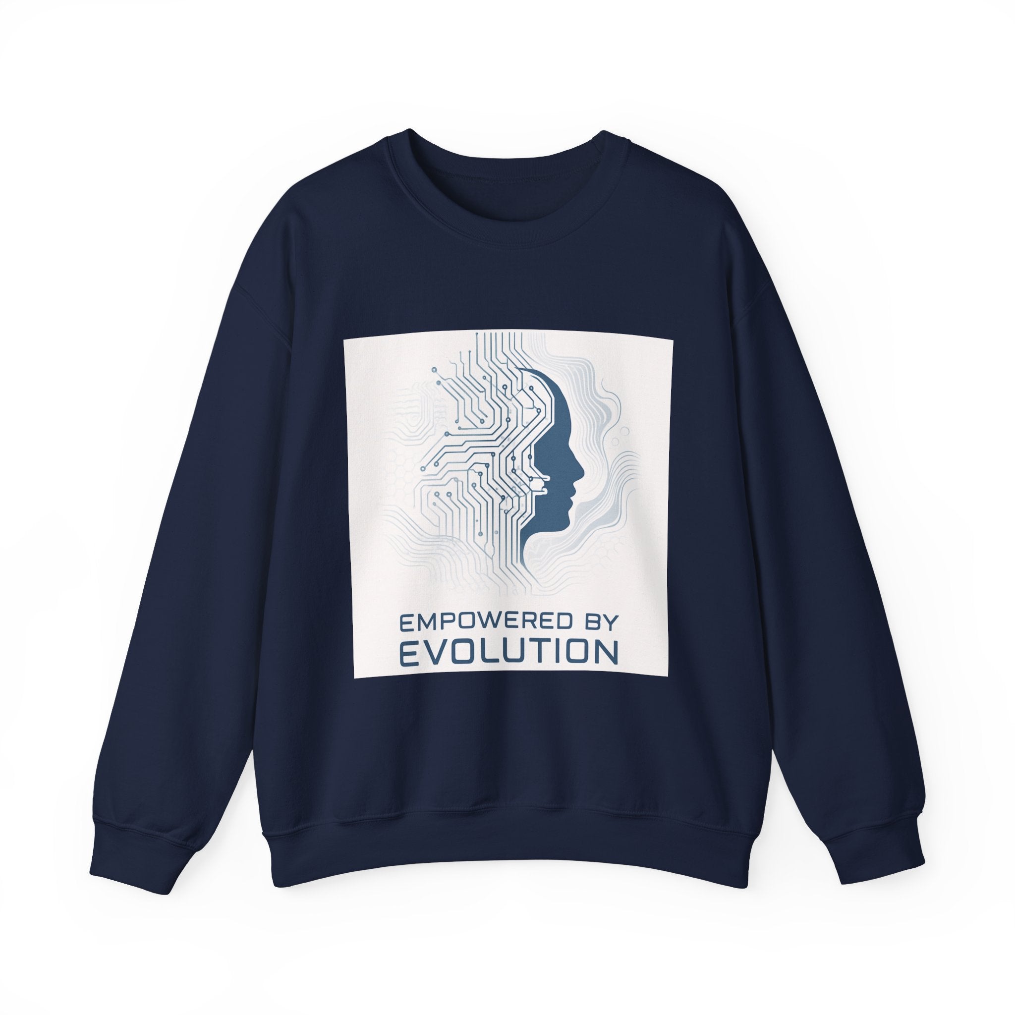 Soft, warm, and quietly futuristic — this crewneck wraps you in a breathable midweight blend while carrying a subtle statement. A minimalist circuit-board silhouette merges with a human profile above the words “Empowered by Evolution,” giving the sweatshirt a thoughtful, forward-looking vibe. Wear it on coding sprints, late-night study sessions, or weekend coffee runs; the clean white canvas keeps the design crisp and wearable while the classic crew cut and ribbed collar hold their shape through repeated wear. Thoughtful details like tear-away neck labels and double-needle stitching mean it feels as reliable as the ideas it represents. Product features - 50/50 cotton-poly midweight (8.0 oz/yd²) for warmth without bulk - Tubular knit construction — no side seams for a smooth, waste-reducing fit - Ribbed knit collar and double-needle stitching for lasting shape and durability - DTG front print with DTF inner neck label; embroidery available on chest or wrists - OEKO-TEX dyes, ethically grown US cotton, and safety compliance details Care instructions - Machine wash: cold (max 30C or 90F) - Non-chlorine: bleach as needed - Tumble dry: low heat - Do not iron - Do not dryclean