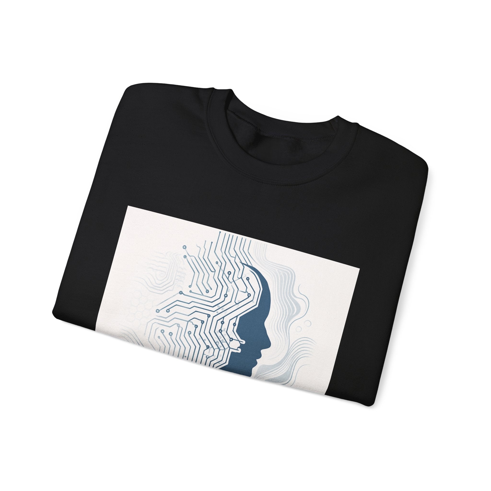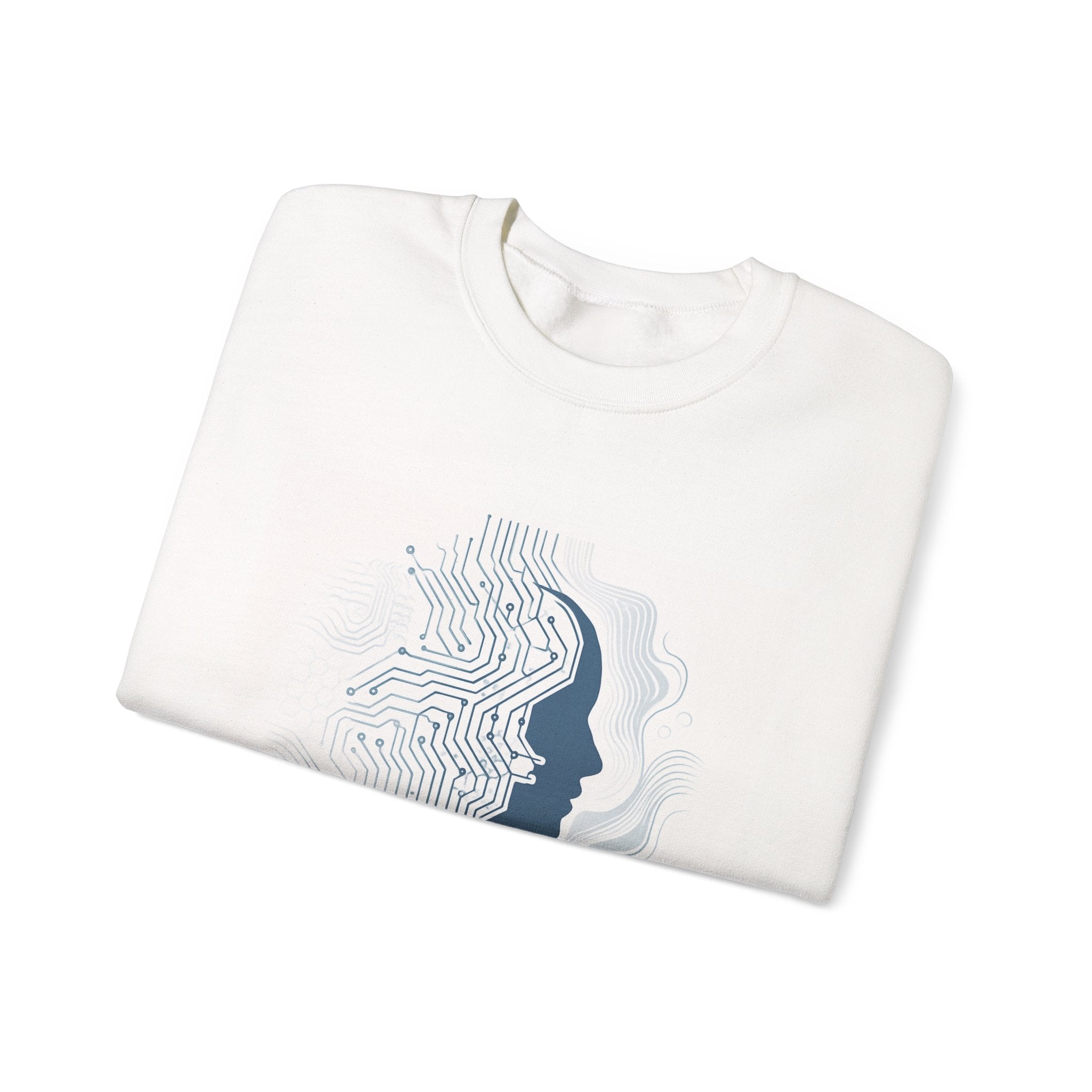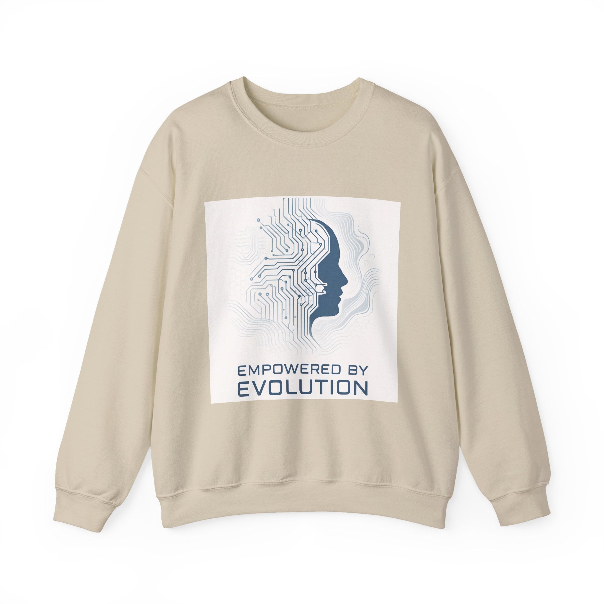 Soft, warm, and quietly futuristic — this crewneck wraps you in a breathable midweight blend while carrying a subtle statement. A minimalist circuit-board silhouette merges with a human profile above the words “Empowered by Evolution,” giving the sweatshirt a thoughtful, forward-looking vibe. Wear it on coding sprints, late-night study sessions, or weekend coffee runs; the clean white canvas keeps the design crisp and wearable while the classic crew cut and ribbed collar hold their shape through repeated wear. Thoughtful details like tear-away neck labels and double-needle stitching mean it feels as reliable as the ideas it represents. Product features - 50/50 cotton-poly midweight (8.0 oz/yd²) for warmth without bulk - Tubular knit construction — no side seams for a smooth, waste-reducing fit - Ribbed knit collar and double-needle stitching for lasting shape and durability - DTG front print with DTF inner neck label; embroidery available on chest or wrists - OEKO-TEX dyes, ethically grown US cotton, and safety compliance details Care instructions - Machine wash: cold (max 30C or 90F) - Non-chlorine: bleach as needed - Tumble dry: low heat - Do not iron - Do not dryclean