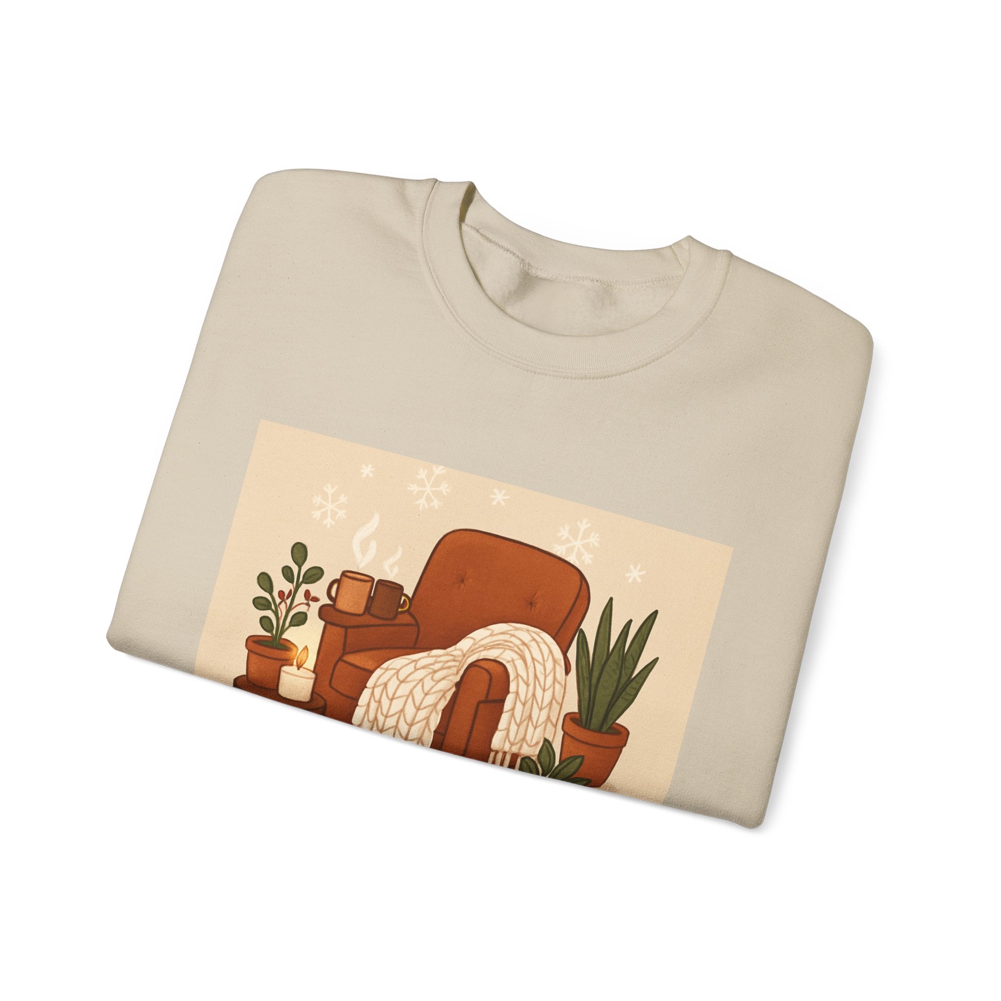 Slide into a sweatshirt that feels like a warm, quiet evening at home. Soft, slightly roomy, and built to last, this crewneck wears like a familiar hug—an armchair, a knit throw, a steaming mug on the side table. The front art shows a cozy reading nook with potted plants, a knit blanket, and warm amber tones that speak to slow nights and intentional comfort. Wear it while you curl up with a book, rearrange the living room, or host a low-key get-together with the people who make your house feel like home. It’s about the small rituals: sinking into the couch, the rustle of pages, the soft glow of lamps. This sweatshirt blends durability with a lived-in, welcoming vibe so it stays part of your home rhythm for seasons to come. Product features - 50/50 cotton-poly blend (8.0 oz/yd²) for medium-heavy warmth and durability - Classic crewneck with double-needle stitching at shoulders, armholes, neck, waistband, and cuffs - Tubular knit construction (no side seams) for a smooth, waste-reducing finish - Embroidered or printed decoration options; DTF inner neck labels and DTG exterior prints - OEKO-TEX dyes, ethically sourced US cotton, and safety compliance (flammability, heavy metals, phthalates) Care instructions - Machine wash: cold (max 30C or 90F) - Non-chlorine: bleach as needed - Tumble dry: low heat - Do not iron - Do not dryclean